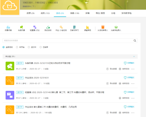 3、孙惠老师主讲的《数学分析》课程,每节课开始针对本堂课的主要内容和学生中存在的主要问题在QQ群视频通话里进行共享屏幕,一边放PPT一边讲解,一边还可以利用白板演示本堂课重点要掌握的内容,每结束一个内容都可以点同学回答问题,也可以监控到学生的听课情况。这个过程大概是40-45分钟,之后就是学生提问(手机和电脑必须同时利用起来,因为视频里全员禁言了,学生要提问只能在QQ对话里举手,我再单独打开他的麦),同学或老师解答(学生解答是有经验值的哦!)。学生完成班课活动里的课堂练习题,下课时间到活动自动关闭(主要考察学生对本堂课内容的掌握情况)。作为数学课程,课后作业的布置也是必须的。此外,针对学生集中的问题每次课我都会录几段小视频(就是自己在纸上一边写一边讲手机拍的那种)上传到班课资源里,对个别同学的问题我也经常是拍视频发到群里,让大家共享。学生普遍反应这样比较清楚、易懂些。