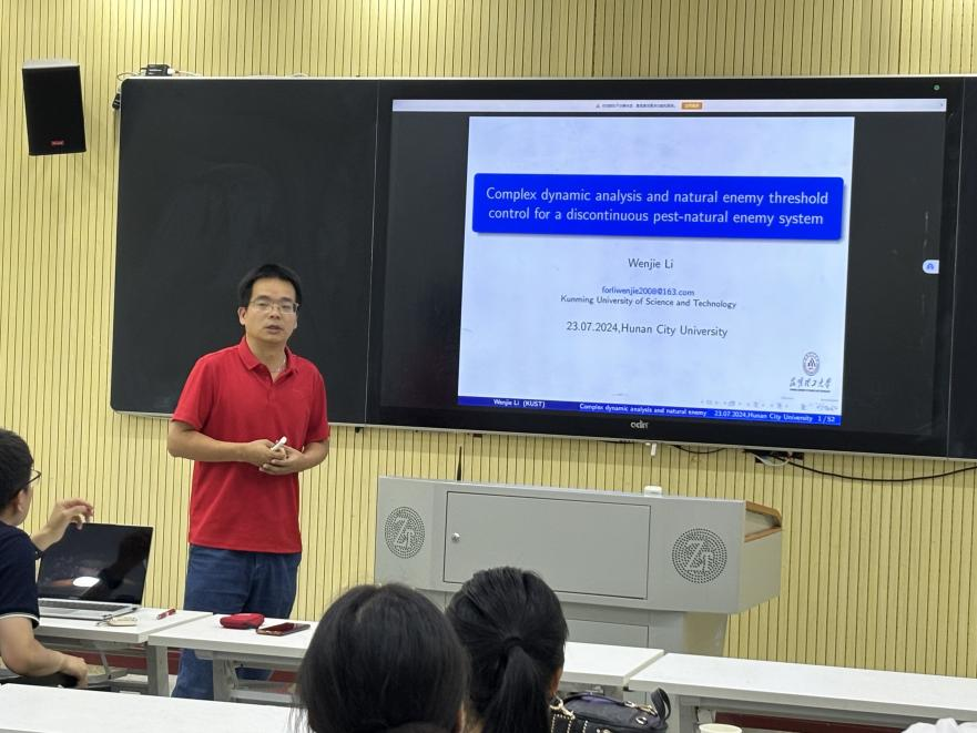 本网讯(通讯员 丁倩)2024年7月23日上午9:30-10:30,suncitygroup太阳集团3-205报告厅内座无虚席,应suncitygroup太阳集团丁倩博士邀请,昆明理工大学李文杰副教授举行了题为《不连续的害虫与天敌生物系统的复杂动力学分析》(Complex dynamic analysis and natural enemy threshold control for a discontinuous pest-natural enemy system)的学术讲座。此次讲座由丁倩博士主持,科技处副处长周双双、suncitygroup太阳集团副院长代安定、学院教师及广大学生出席参加。