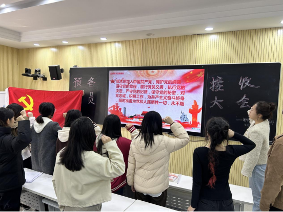 会上,11 位发展对象依次汇报个人情况并宣读入党志愿书,入党介绍人逐一介绍发展对象的培养考察情况,如实反映了大家在思想、学习、工作、生活中的表现。票决程序结束后,新接收的中共预备党员逐一表明态度和决心,支委成员为新接收预备党员现场佩戴党徽,并带领全体新接收预备党员面向党旗庄严宣誓,铿锵有力的誓言彰显出青年党员的责任与担当。