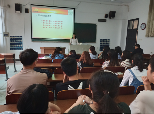 课上,张沙老师对即将离开学校的各位毕业生党员提出了四点殷切希望:一希望各位党员同志能增强党员意识,不辜负组织期望;二希望各位党员同志坚持不断学习,培养信念担当,争创一流业绩;三希望大家毕业之后能正确的行使手中的权力,正确对待利益,保持清正廉洁;四希望大家能积极、主动地参加党内生活,接受教育管理,加强党性修养。接着张沙老师跟各位毕业生党员强调了毕业生党员档案审查要点、党组织关系的转接、介绍信的开具等事宜。最后祝贺各位党员同志经过4年的努力,即将完成大学本科阶段的学习踏上新的征程,祝大家工作顺利,前程似锦!